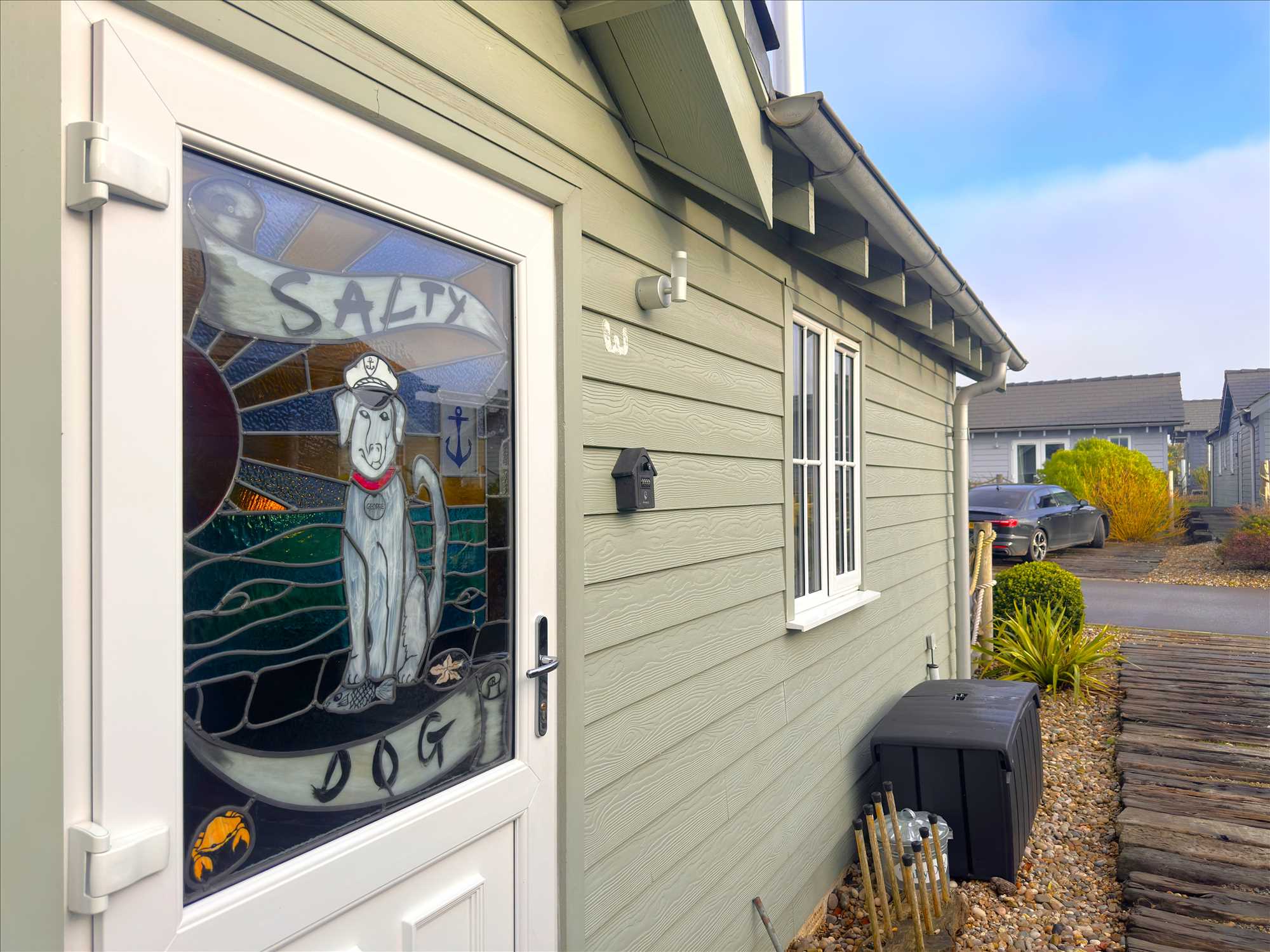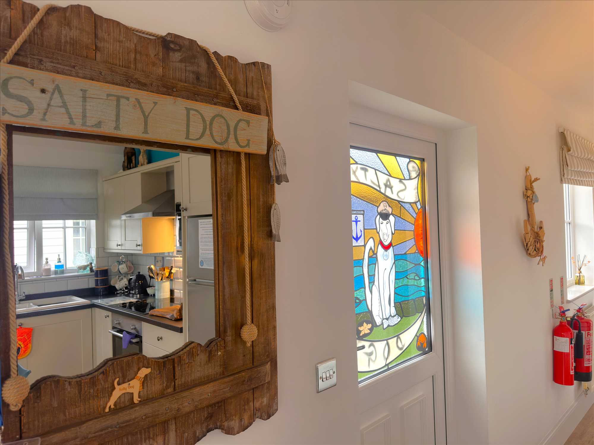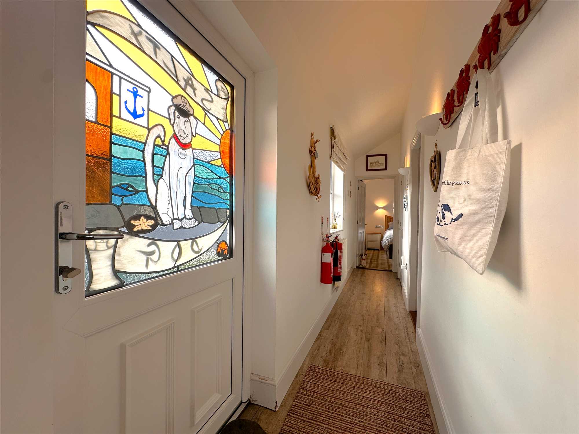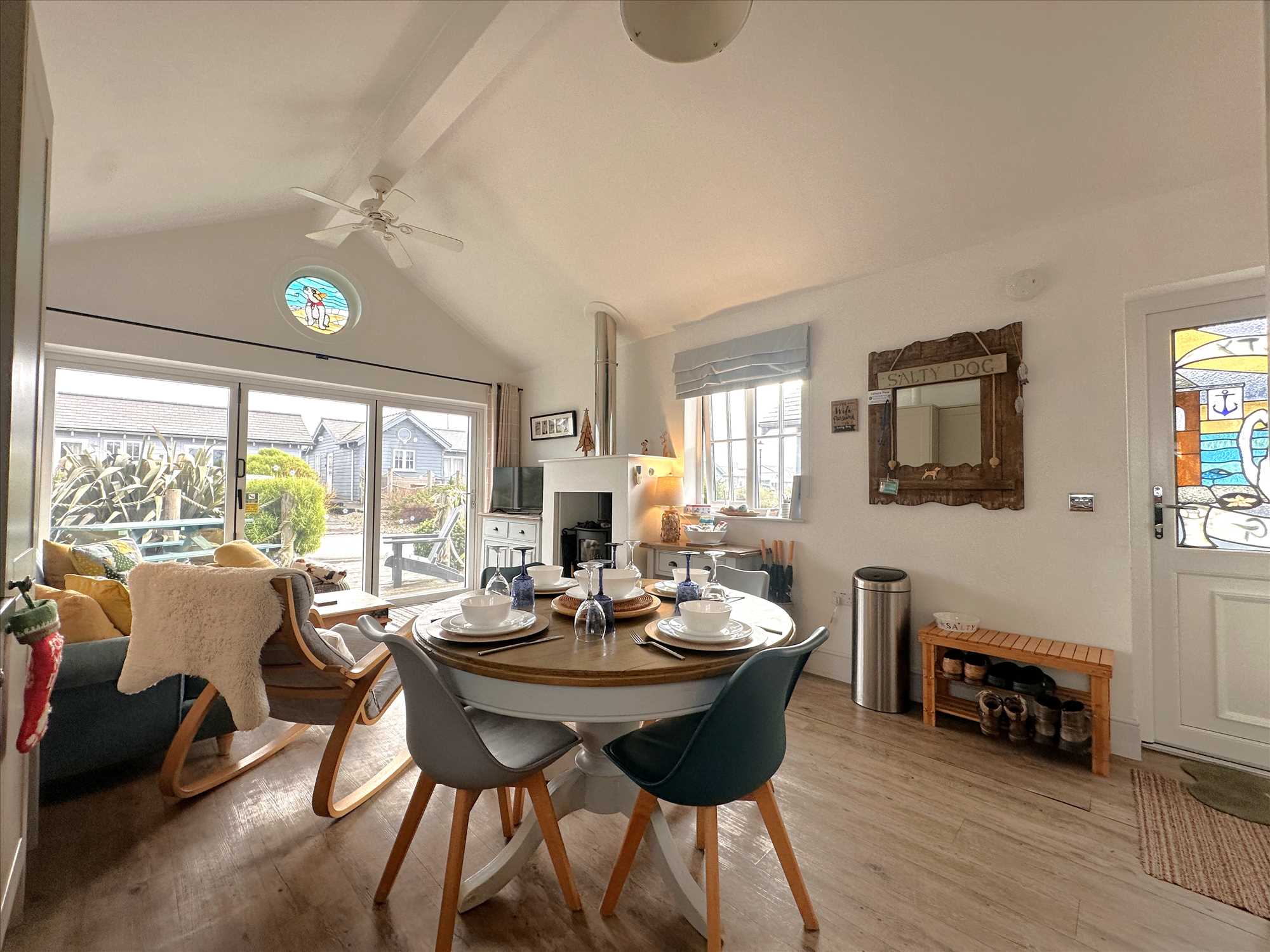 UPVC style double glazed door (with feature 'Salty Dog' stained glass panel) leading from the driveway into the hall, which opens into the kitchen / lounge / diner with doors off to both bedrooms and to the shower room. Central heating radiator. UPVC double glazed window looking to the driveway.