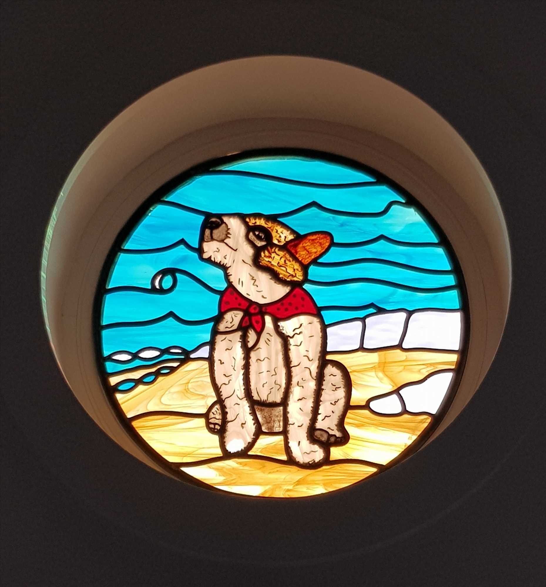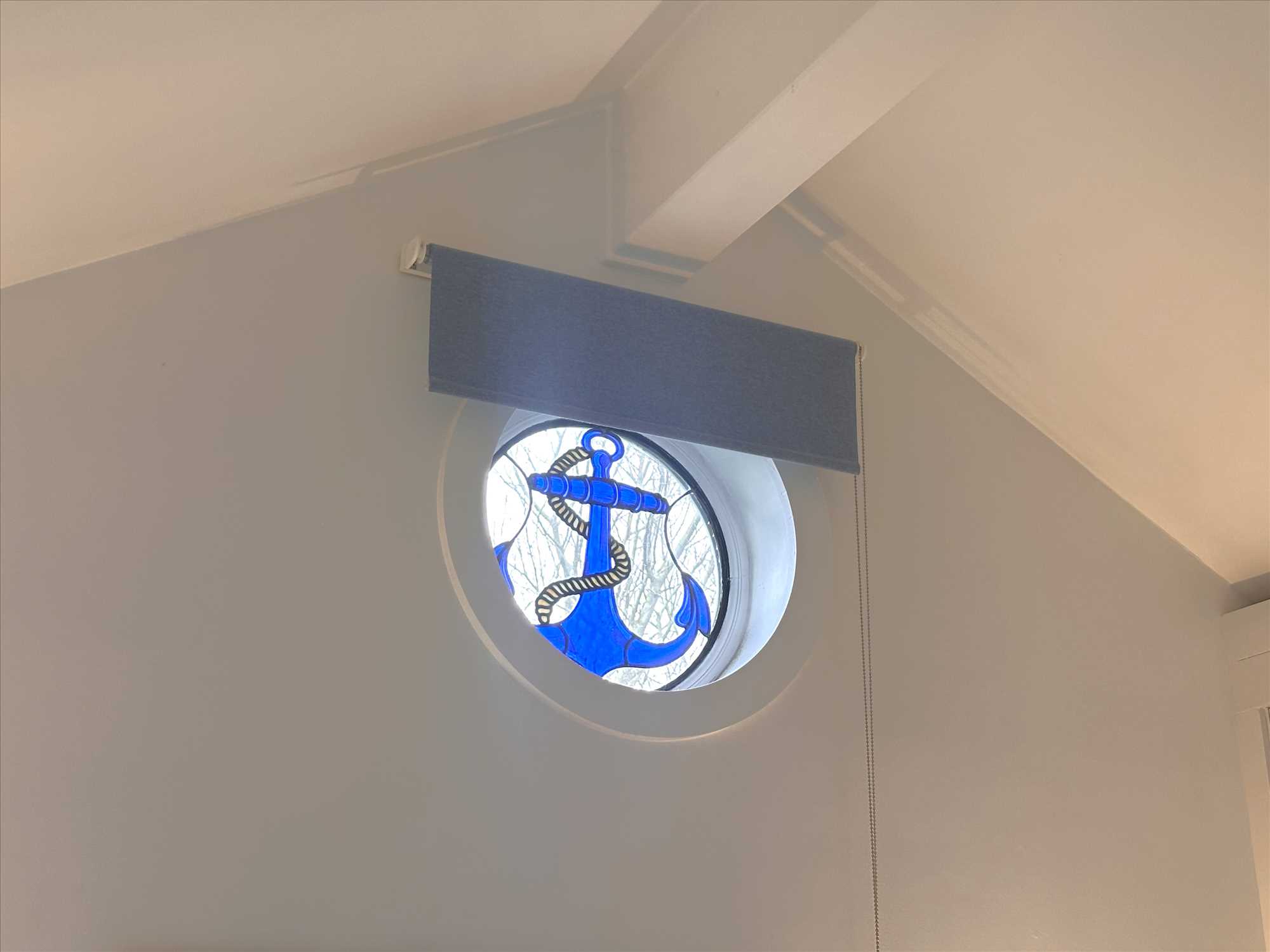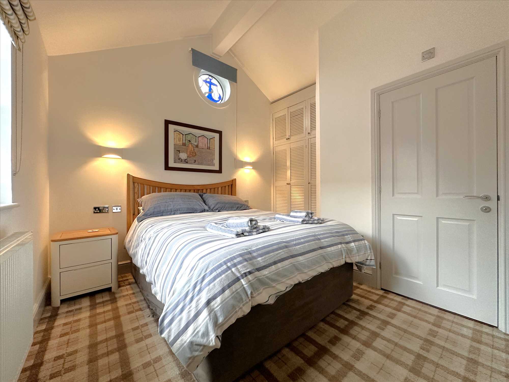 UPVC double glazed window looking to the driveway. Porthole style window with feature stained glass 'blue anchor'. Television point. Central heating radiator. Door to ensuite shower room. Included in the sale is the king size orthopaedic bed and frame.