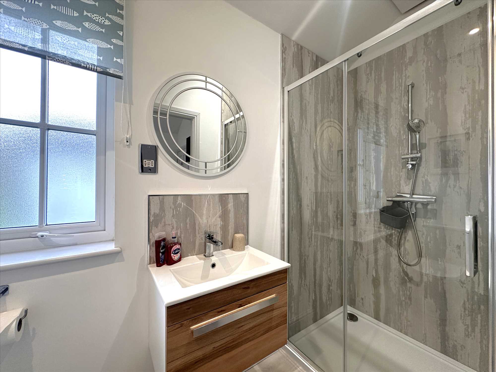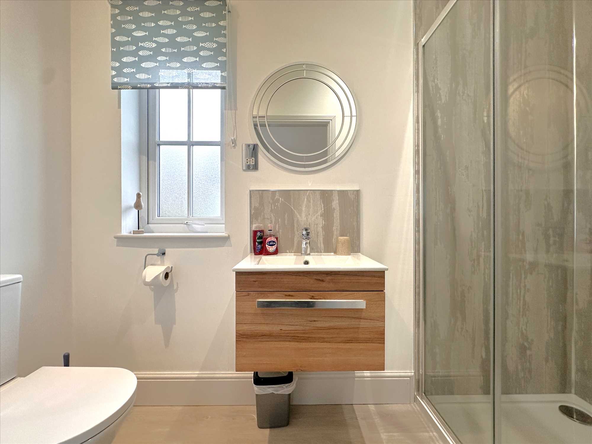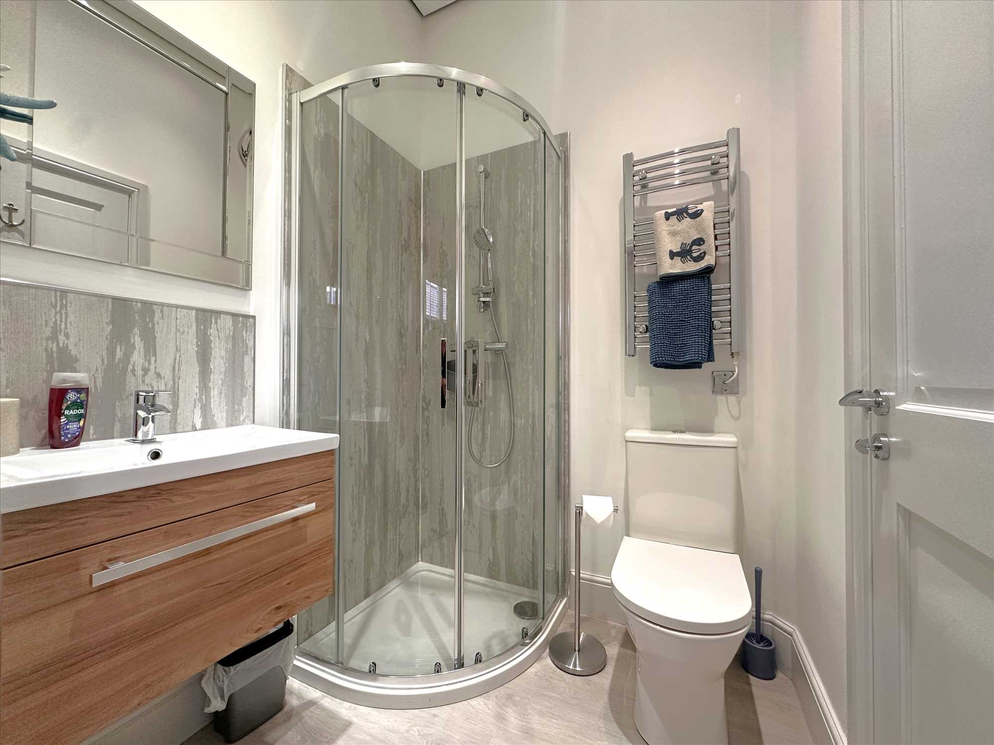 A newly installed shower room, briefly comprising a vanity handwash unit and low suite WC with tiled shower area with mains shower fitting over. Electric towel rail. UPVC double glazed window. Extractor fan.