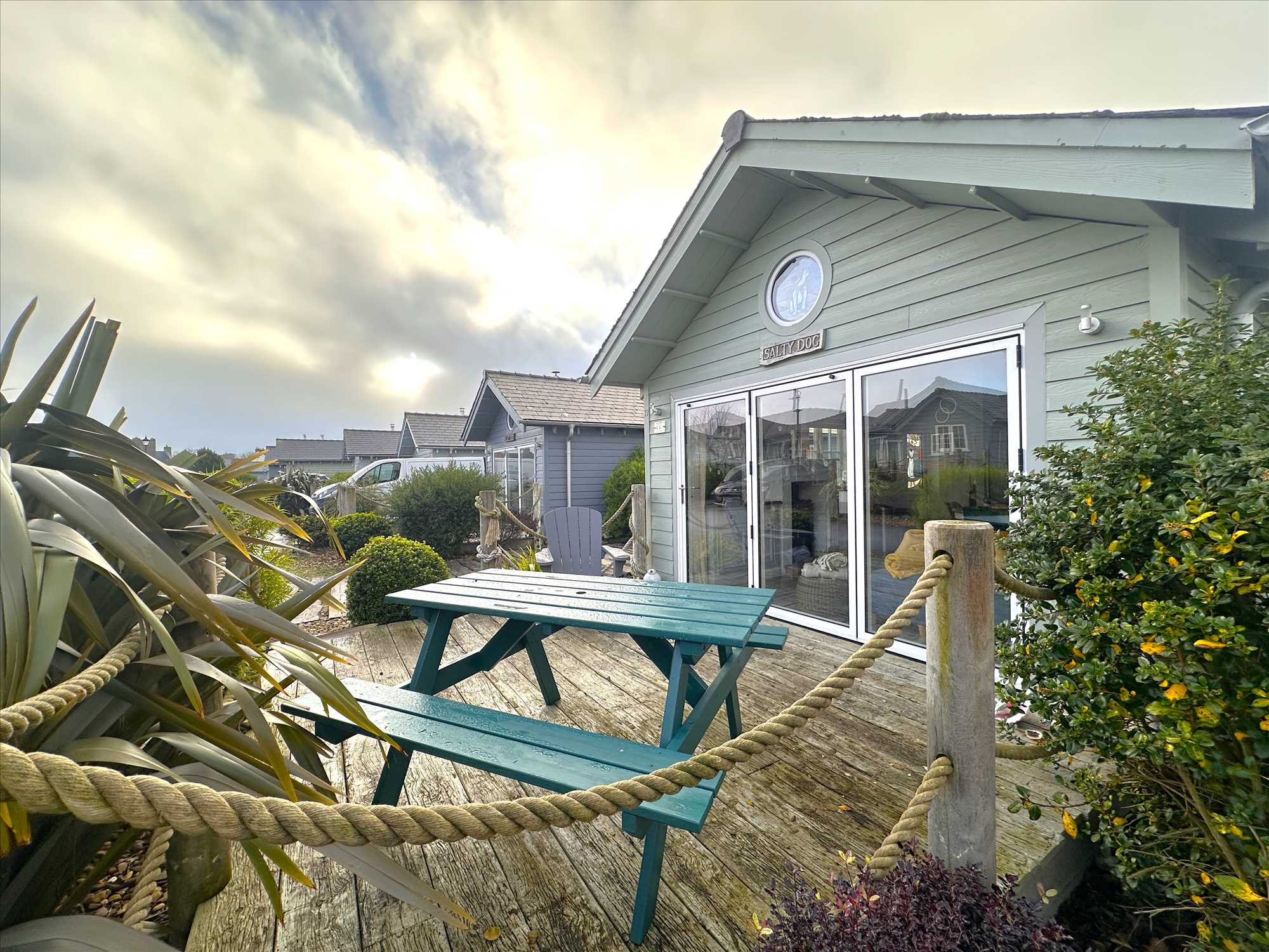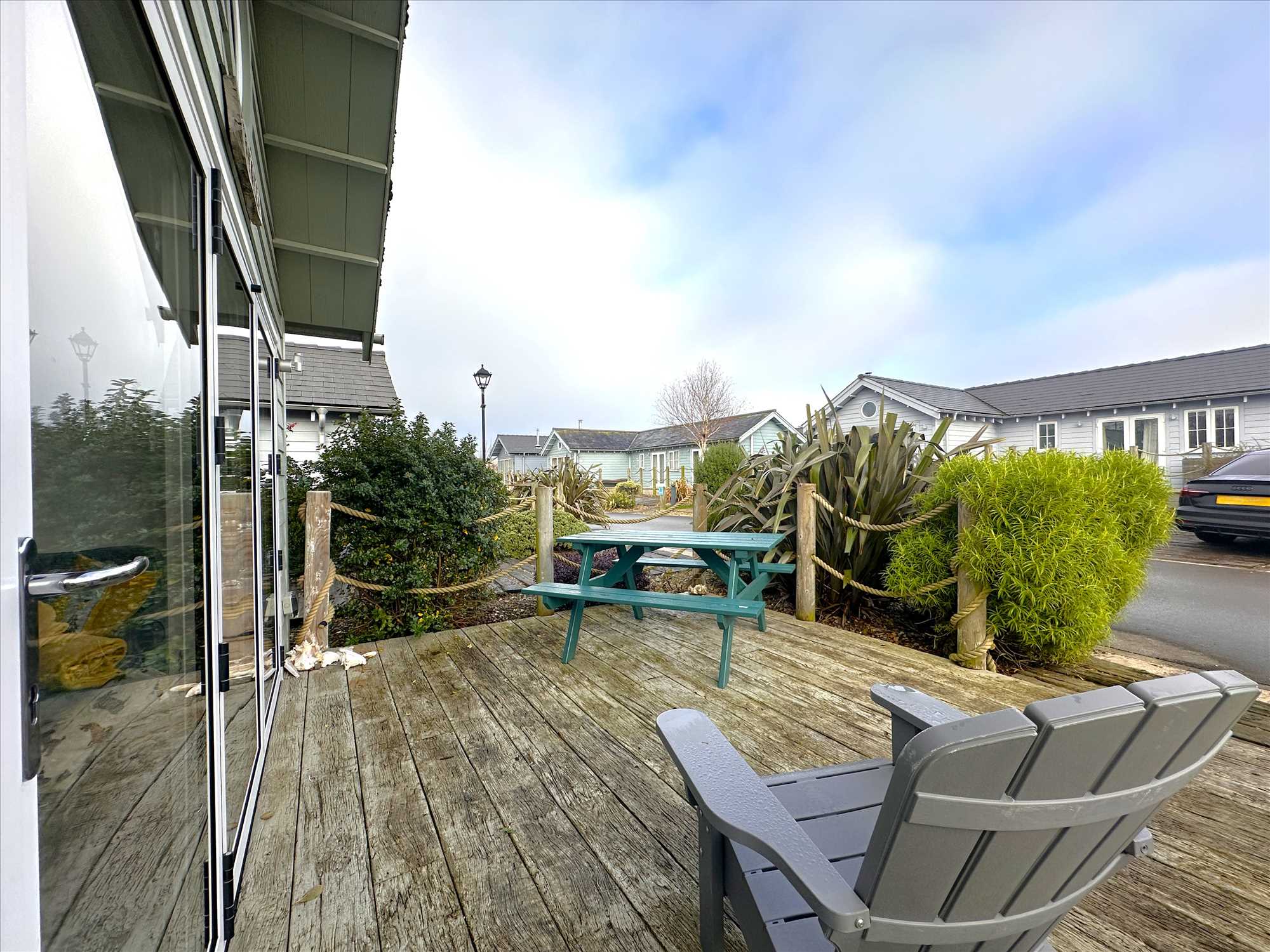 Wood terrace with rope style balustrade, having the benefit of a southerly facing aspect.