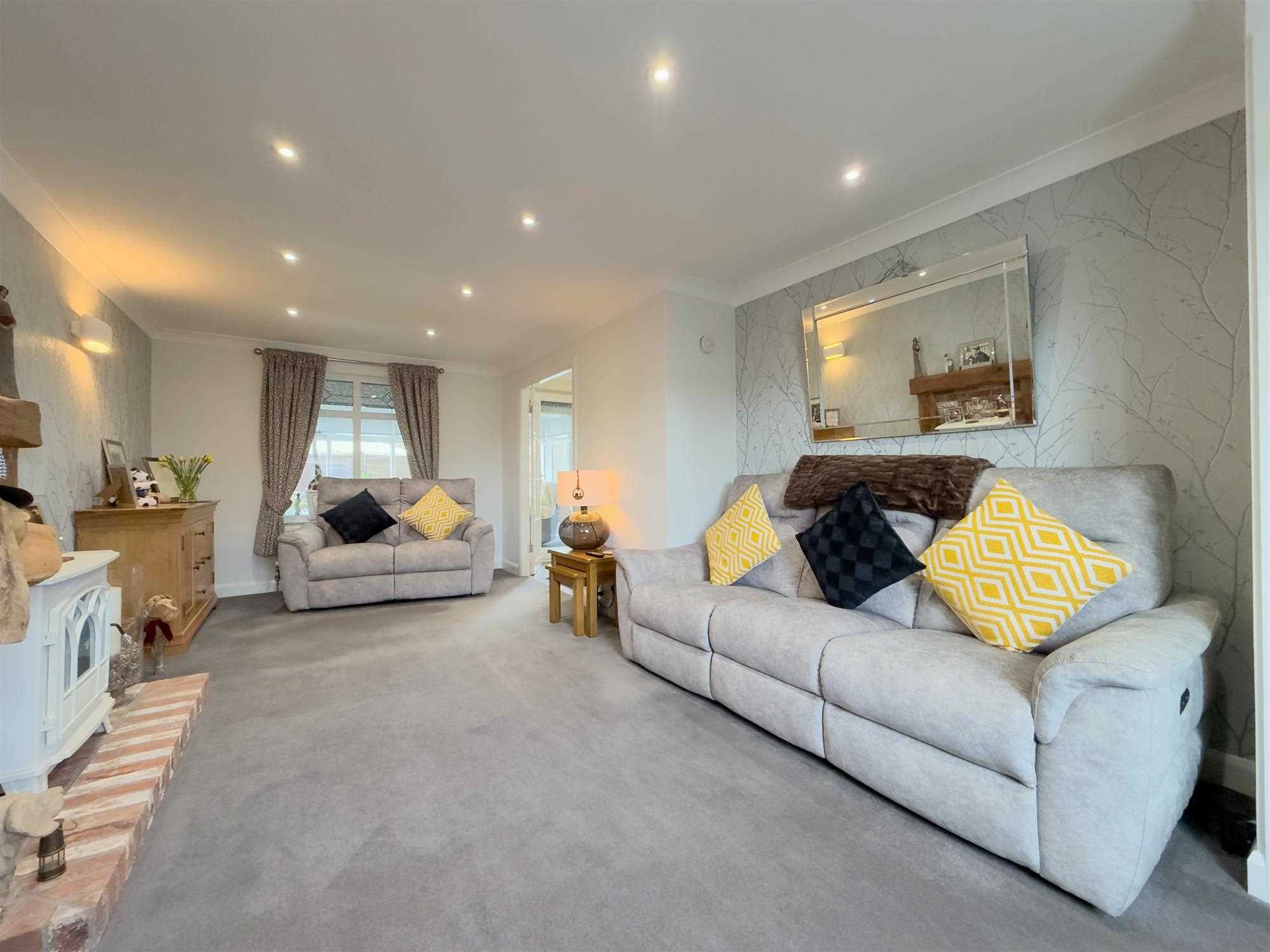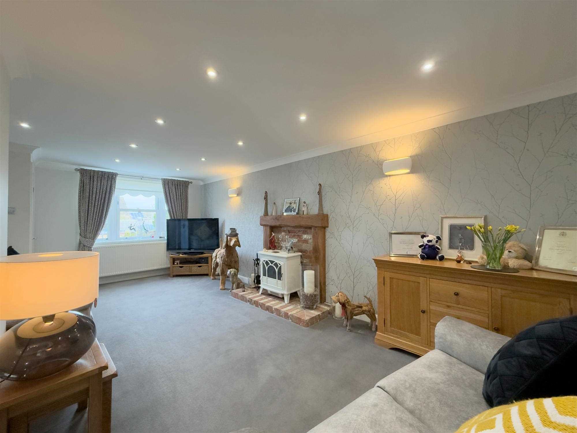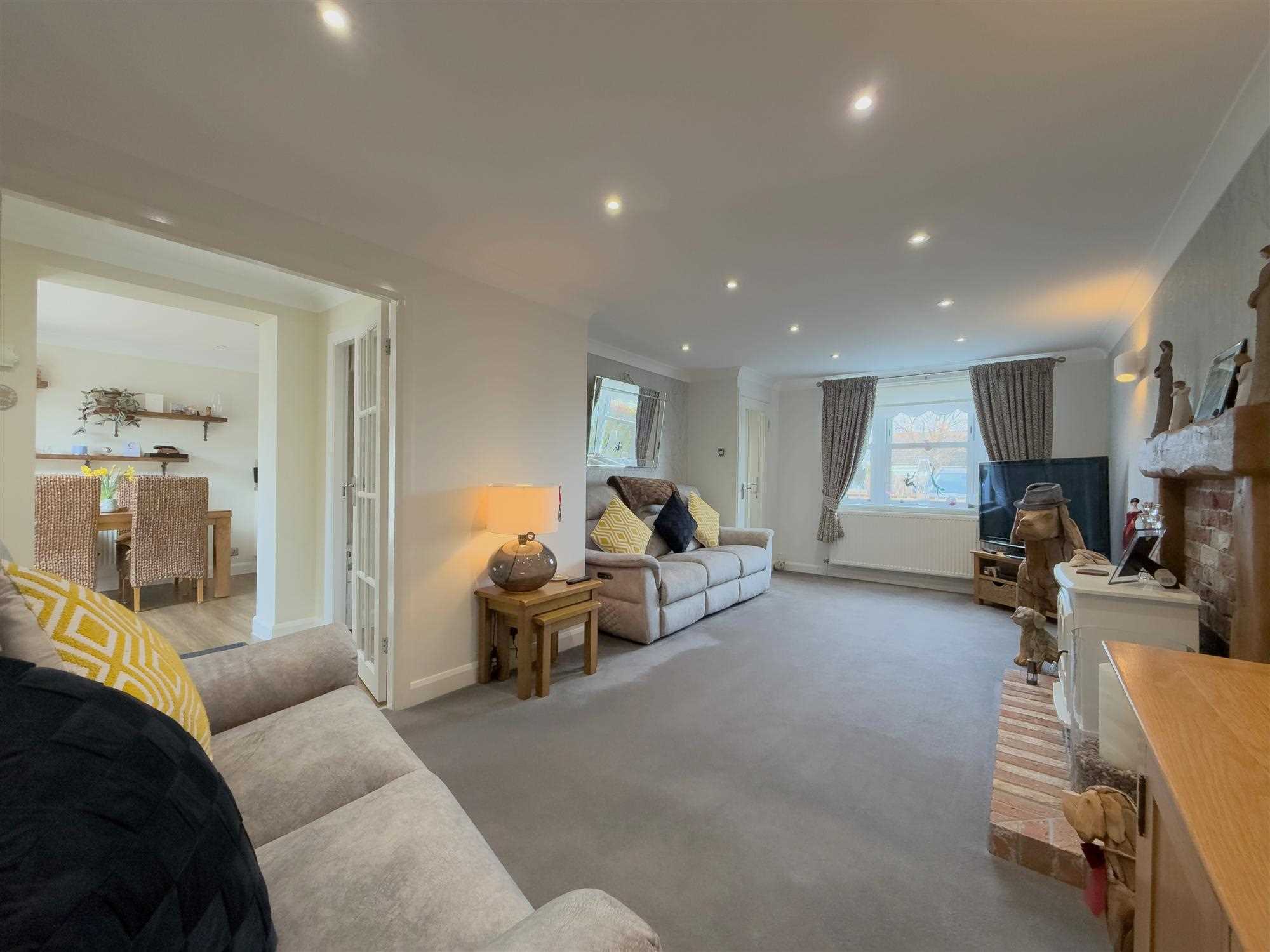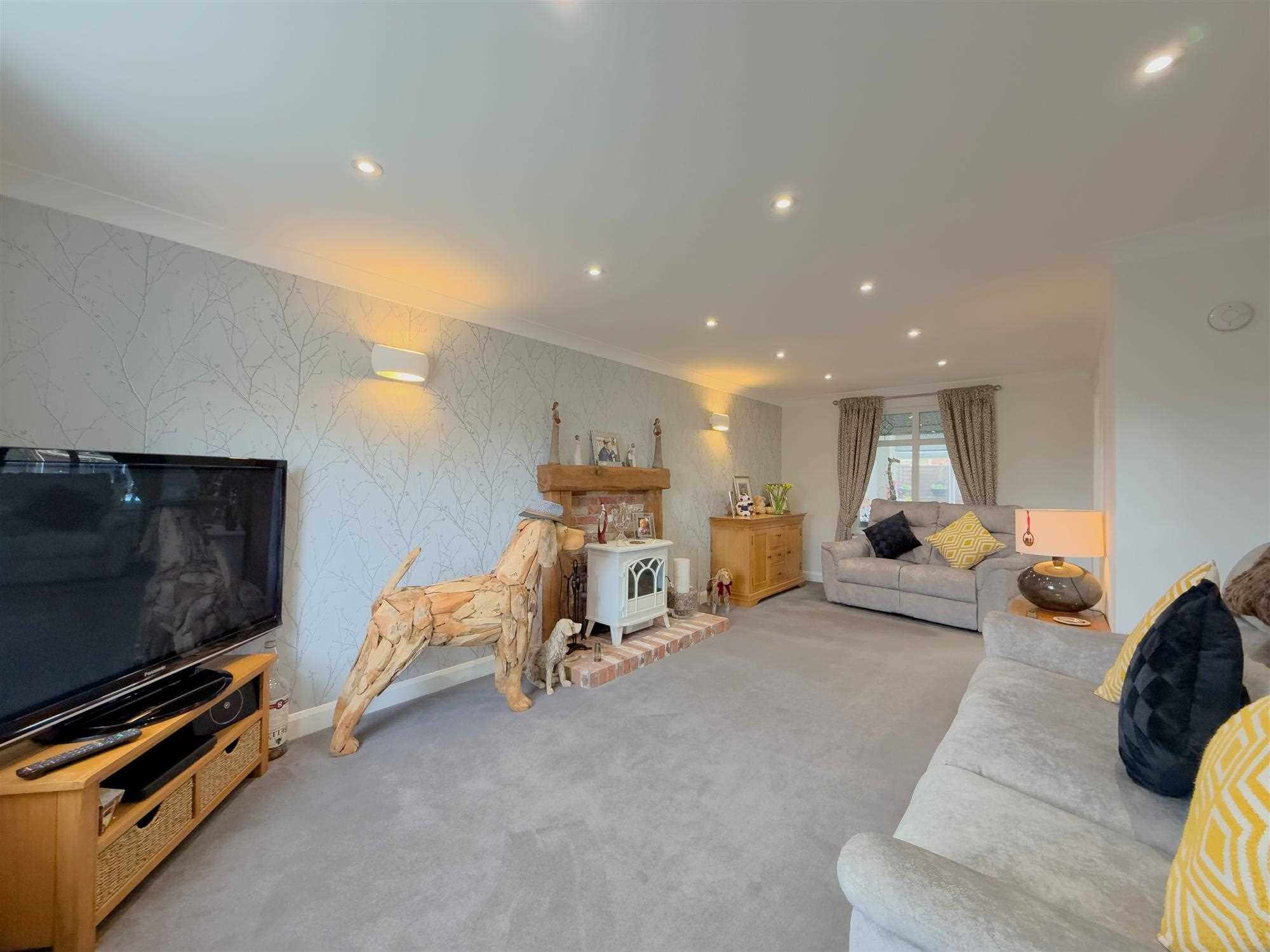 A spacious reception room with two central heating radiators, television and telephone points, LED spotlighting, and a feature mock-beamed fireplace with wall lighting. UPVC double-glazed sash windows to both front and rear aspects. Glazed double doors provide access to the rear entrance hall.