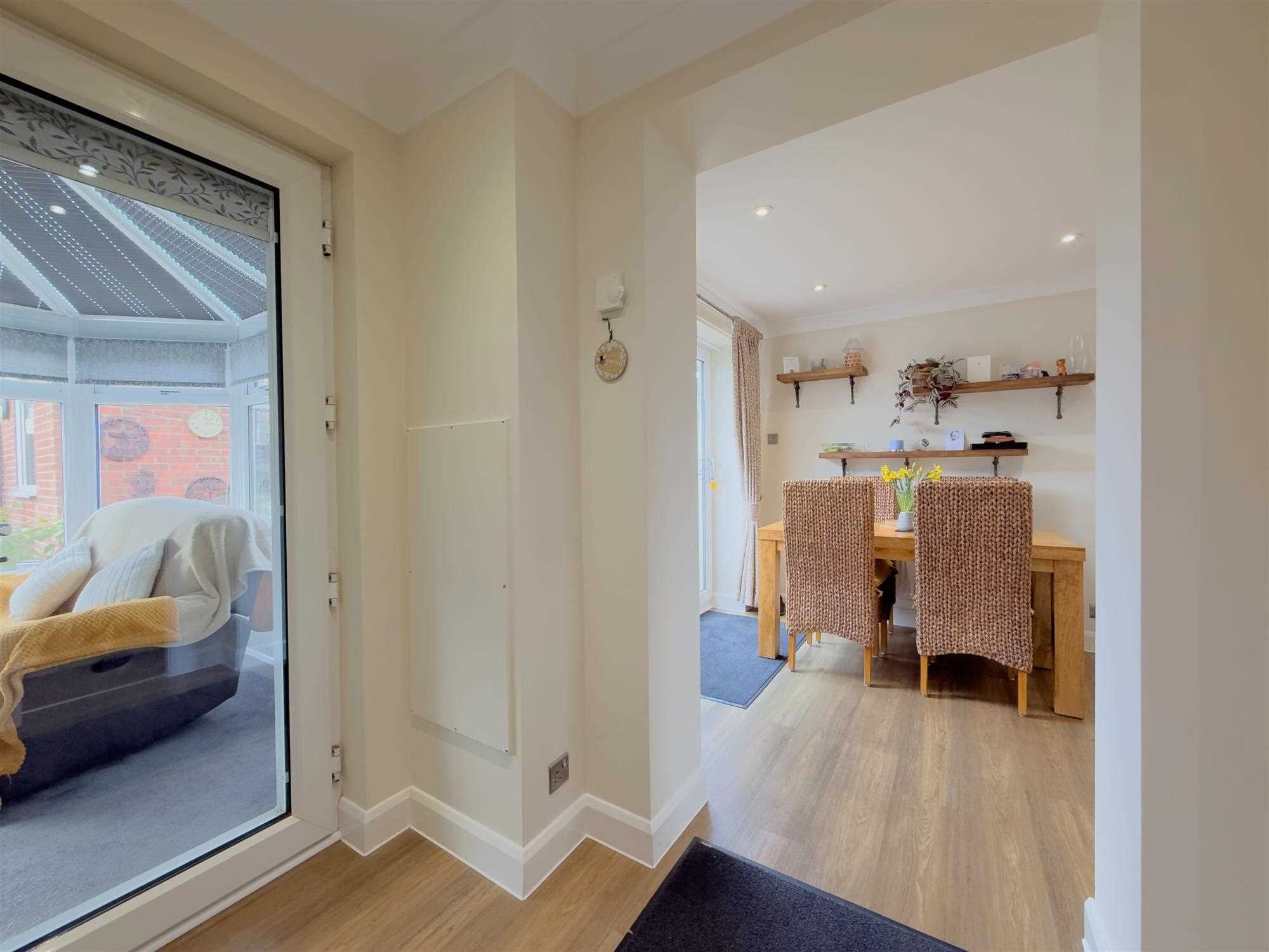 Oak-finished flooring extending through the hall, cloaks cupboard and dining kitchen. LED spotlighting. UPVC double-glazed door to the conservatory, with further doors to the cloakroom and dining kitchen.