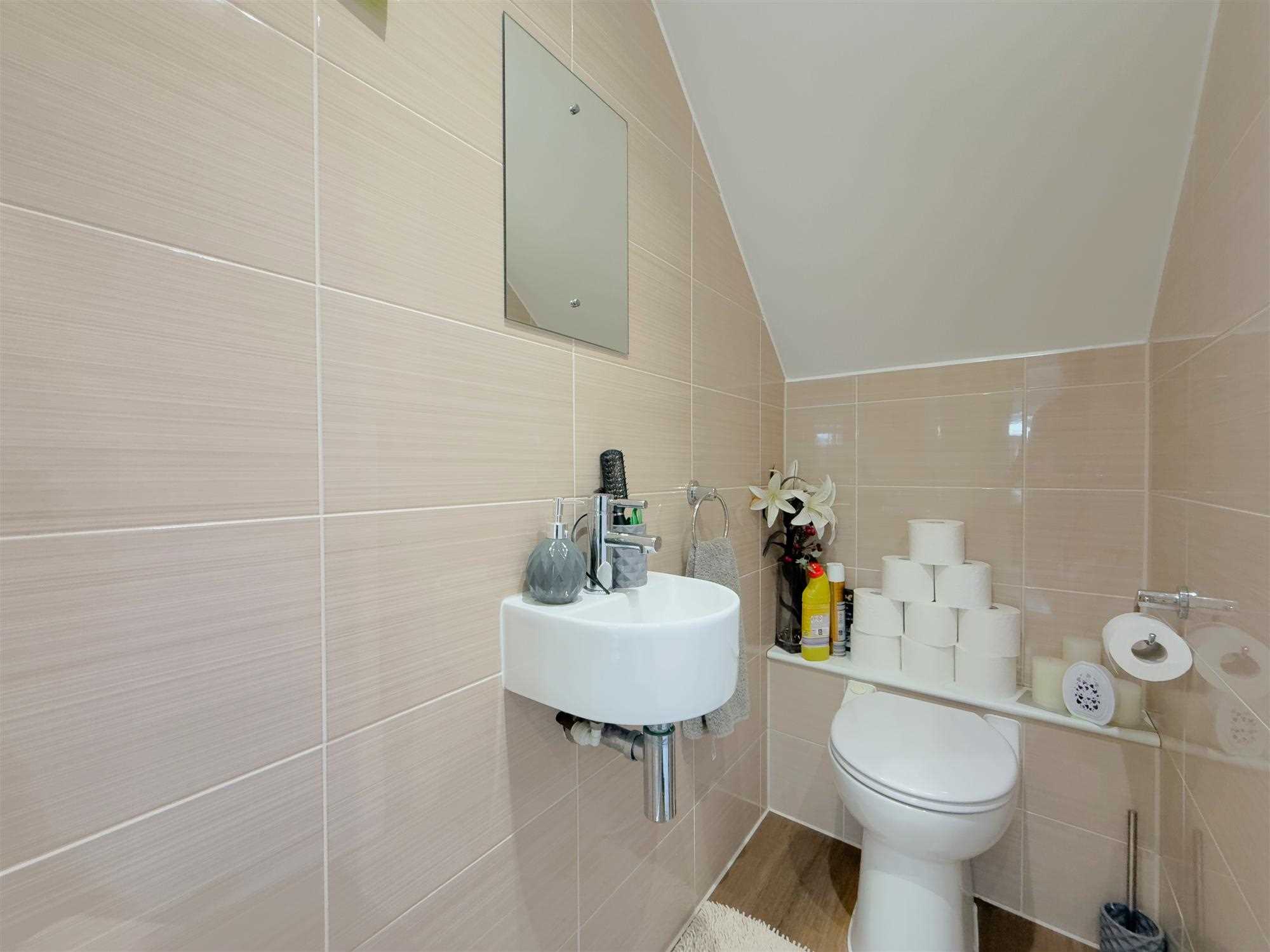 Part-tiled walls with a modern white suite comprising low-level WC and wash hand basin with mirror over. Extractor fan. LED spotlighting. Central heating radiator. Useful recessed alcove providing coat hanging space.