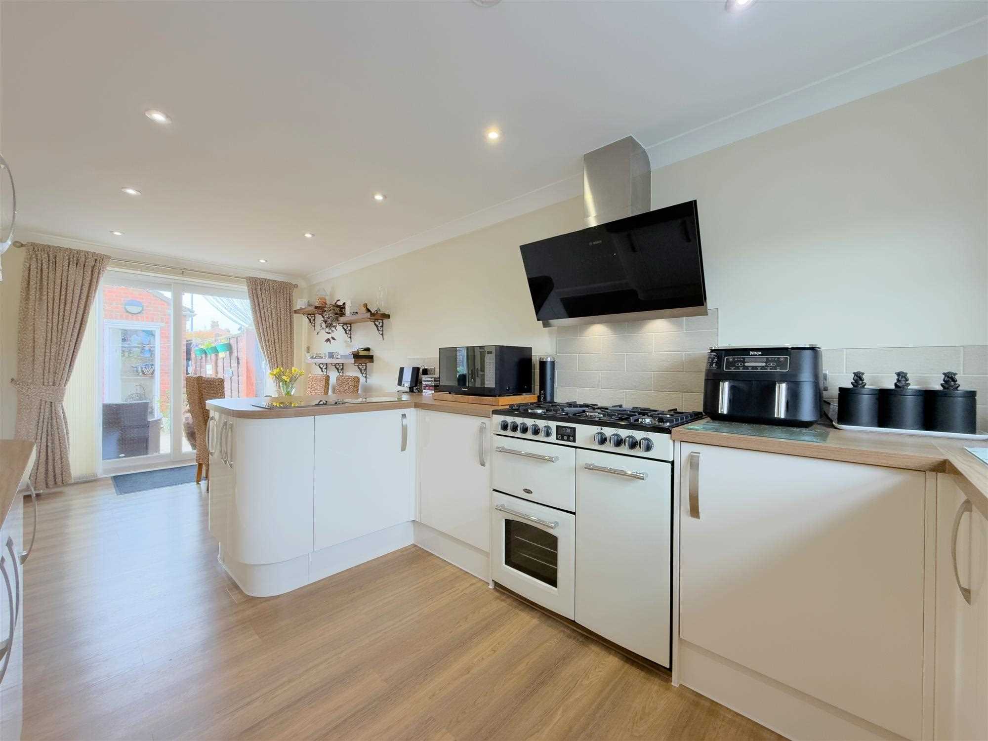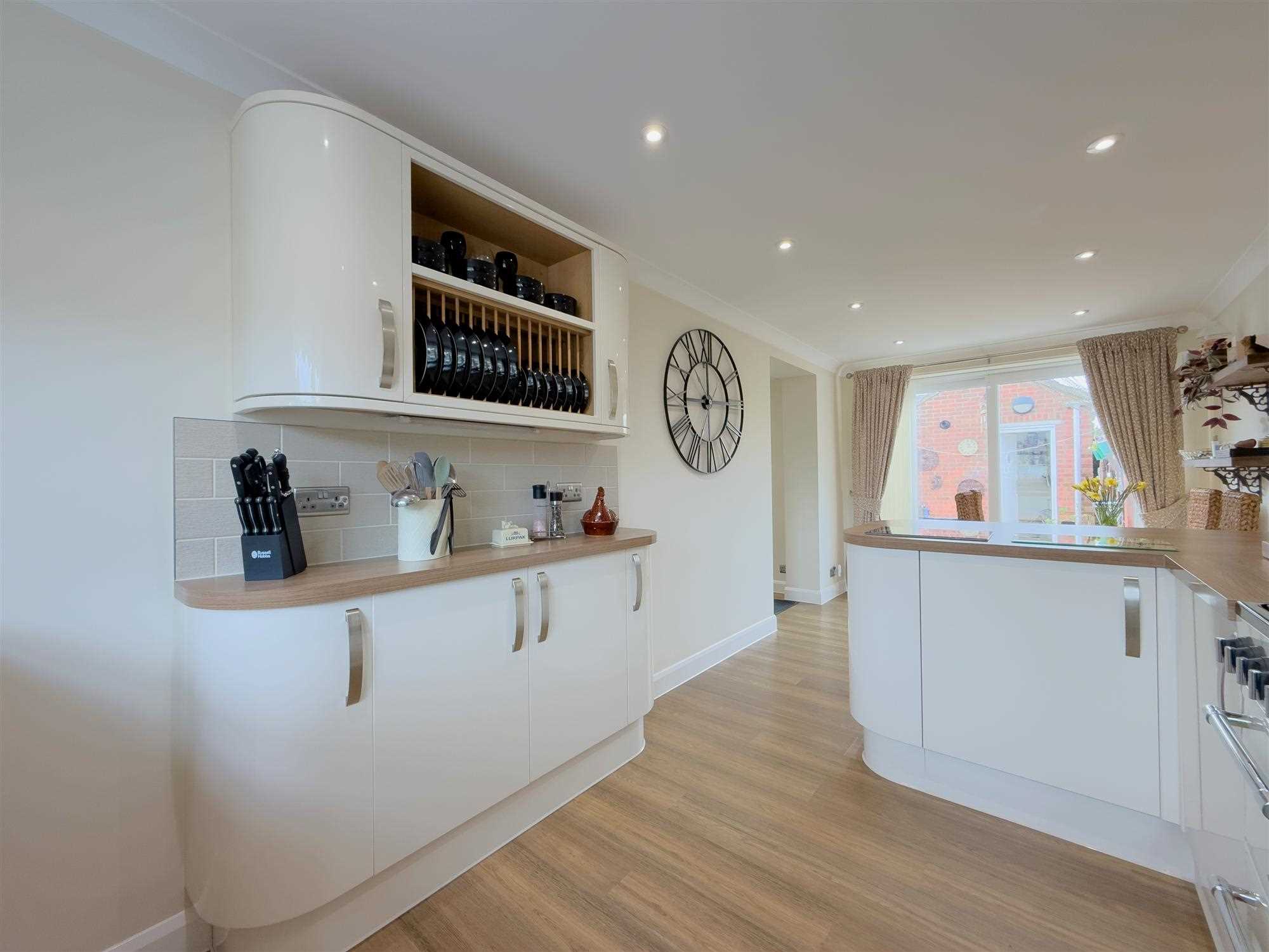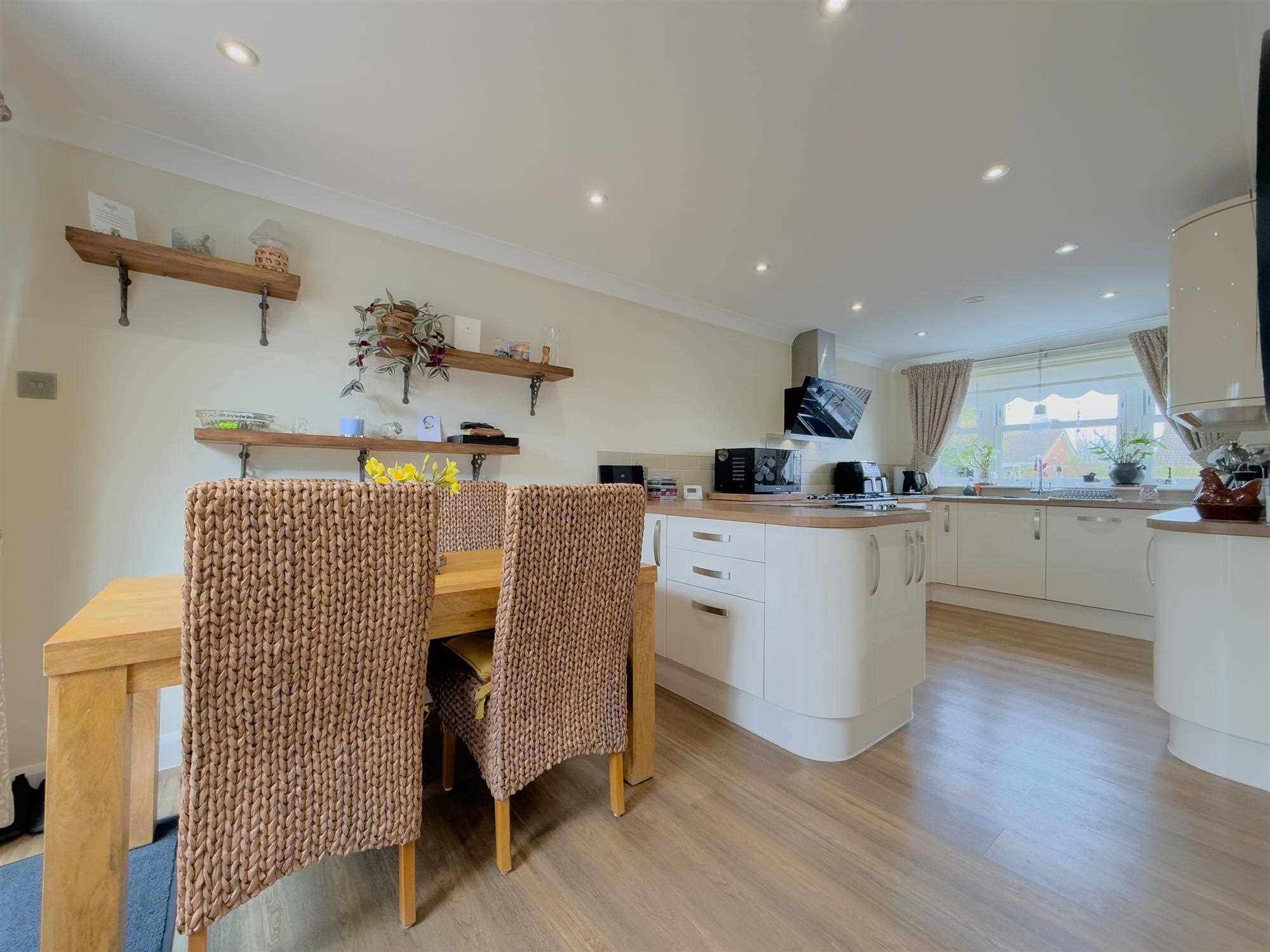 A well-designed open-plan space with kitchen to the front and dining area to the rear, finished with oak flooring and LED spotlighting.