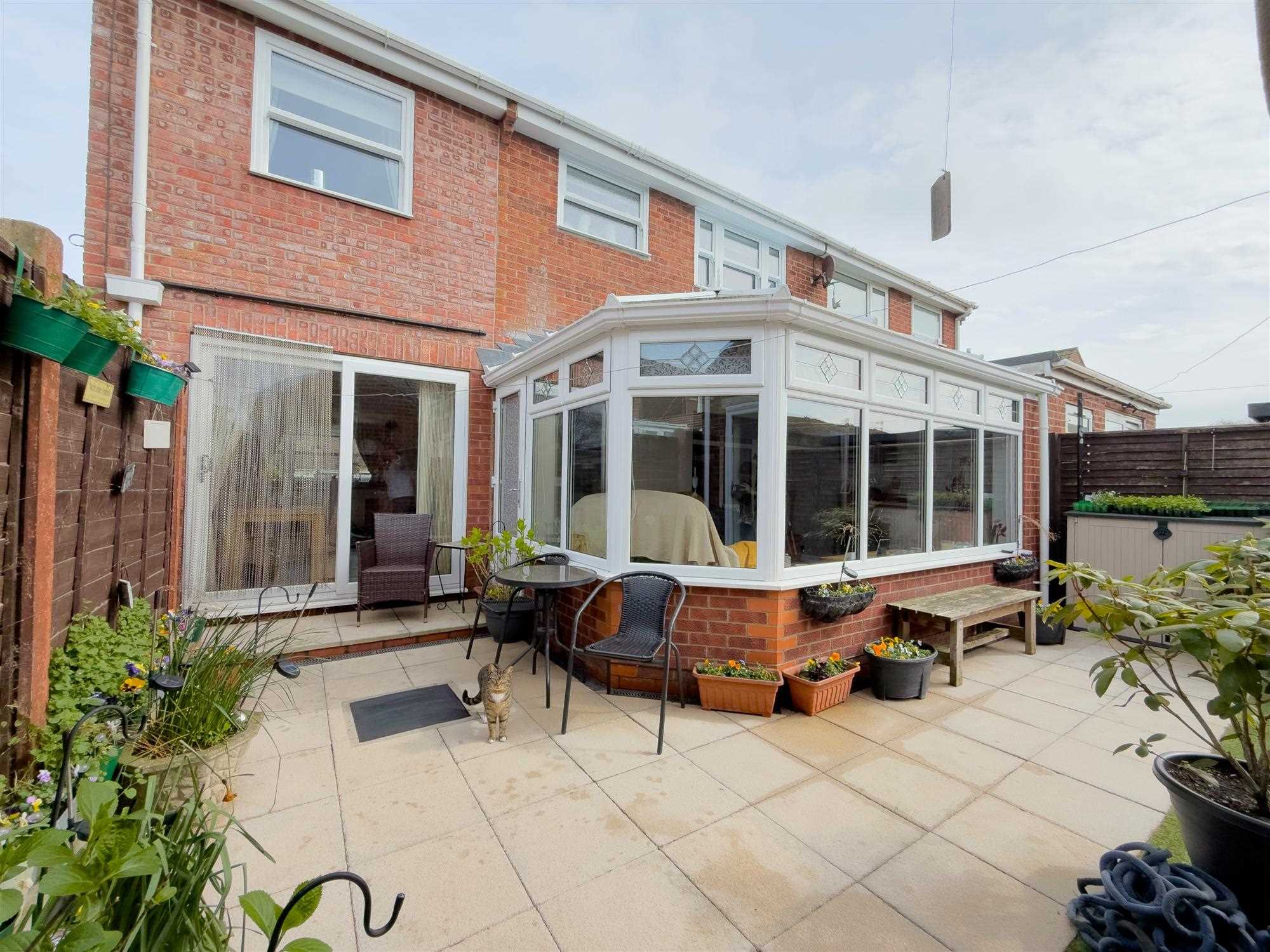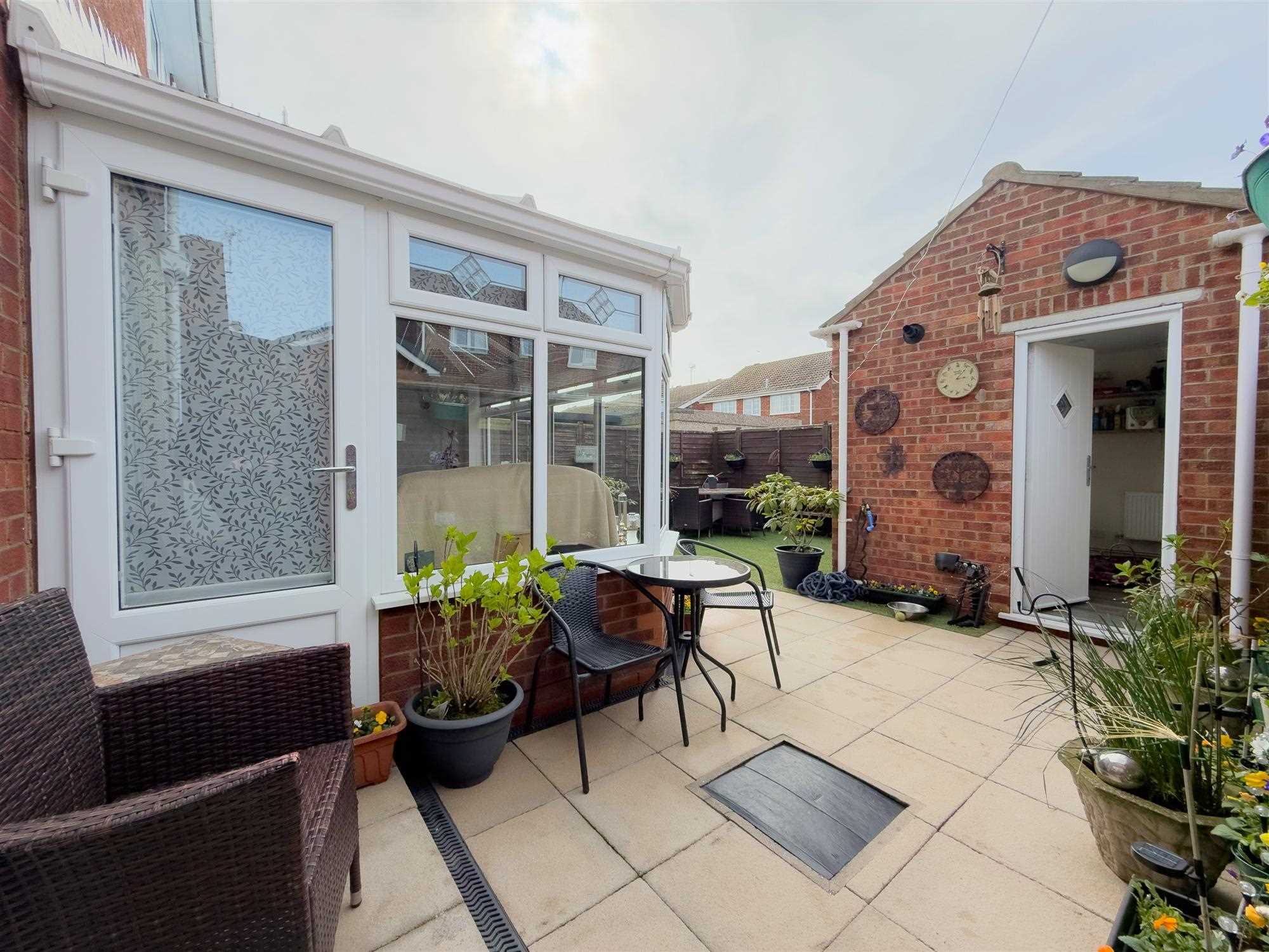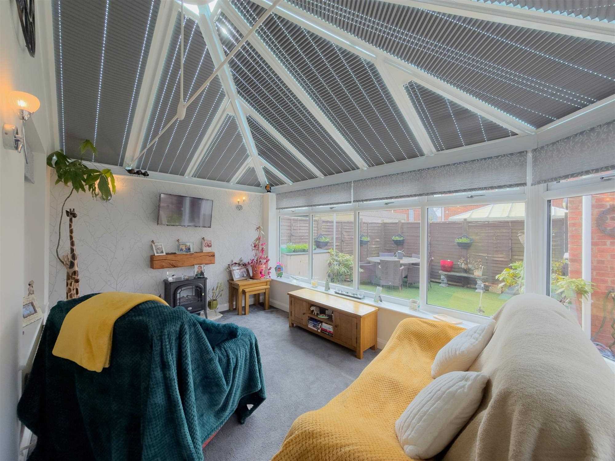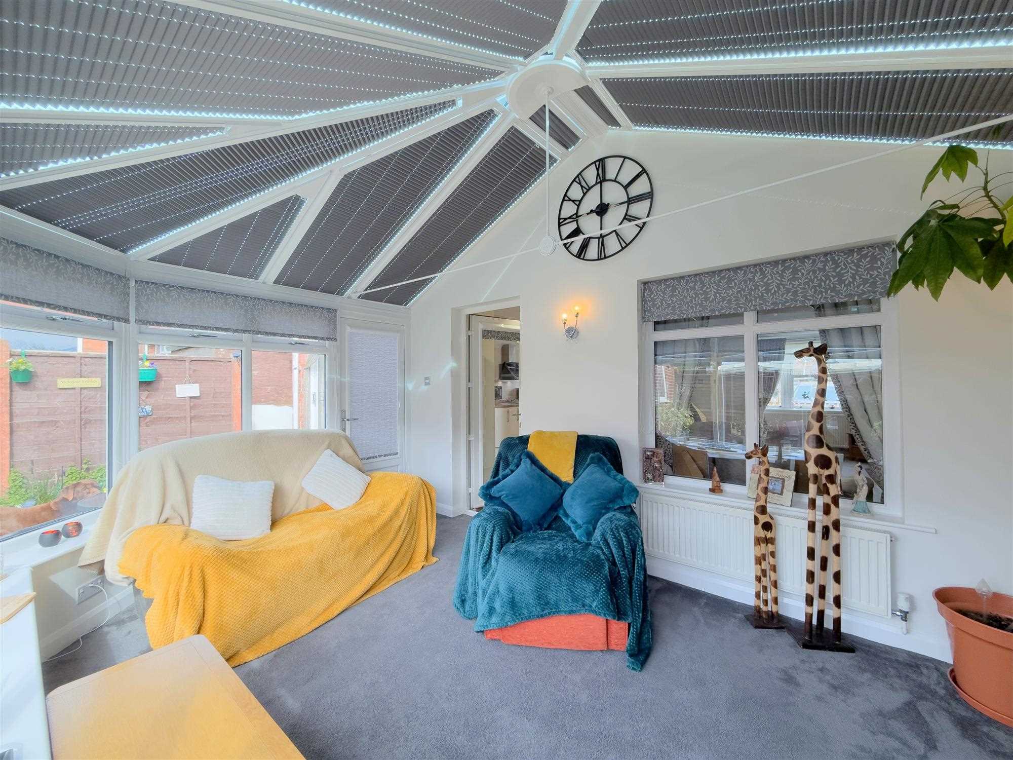 Modern UPVC and brick construction with heat-retaining glazing. Central heating radiator, wall lighting, power points and television point. UPVC double-glazed side door leading to rear garden. Recently fitted bespoke blinds to roof glazing.
