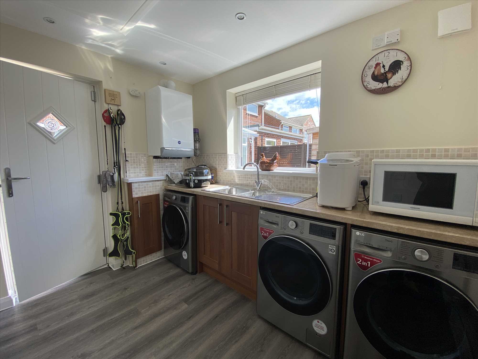Provision for three washing machines and space for a tumble dryer. Two central heating radiators plus wall-mounted electric fan heater. UPVC double-glazed window over the sink overlooking the rear garden. LED spotlighting. Wall-mounted gas-fired combi boiler supplying hot water and central heating. Loft access hatch.