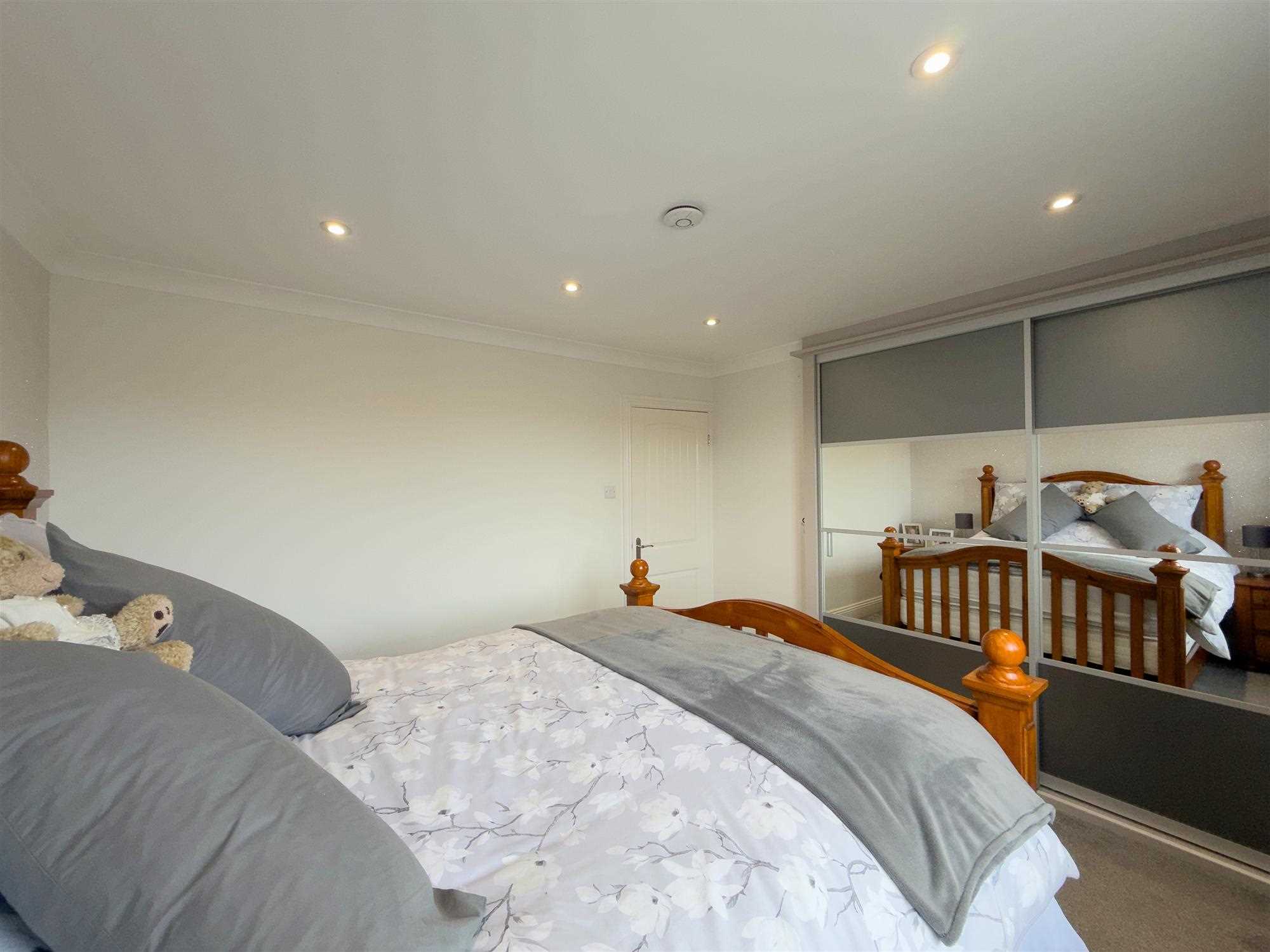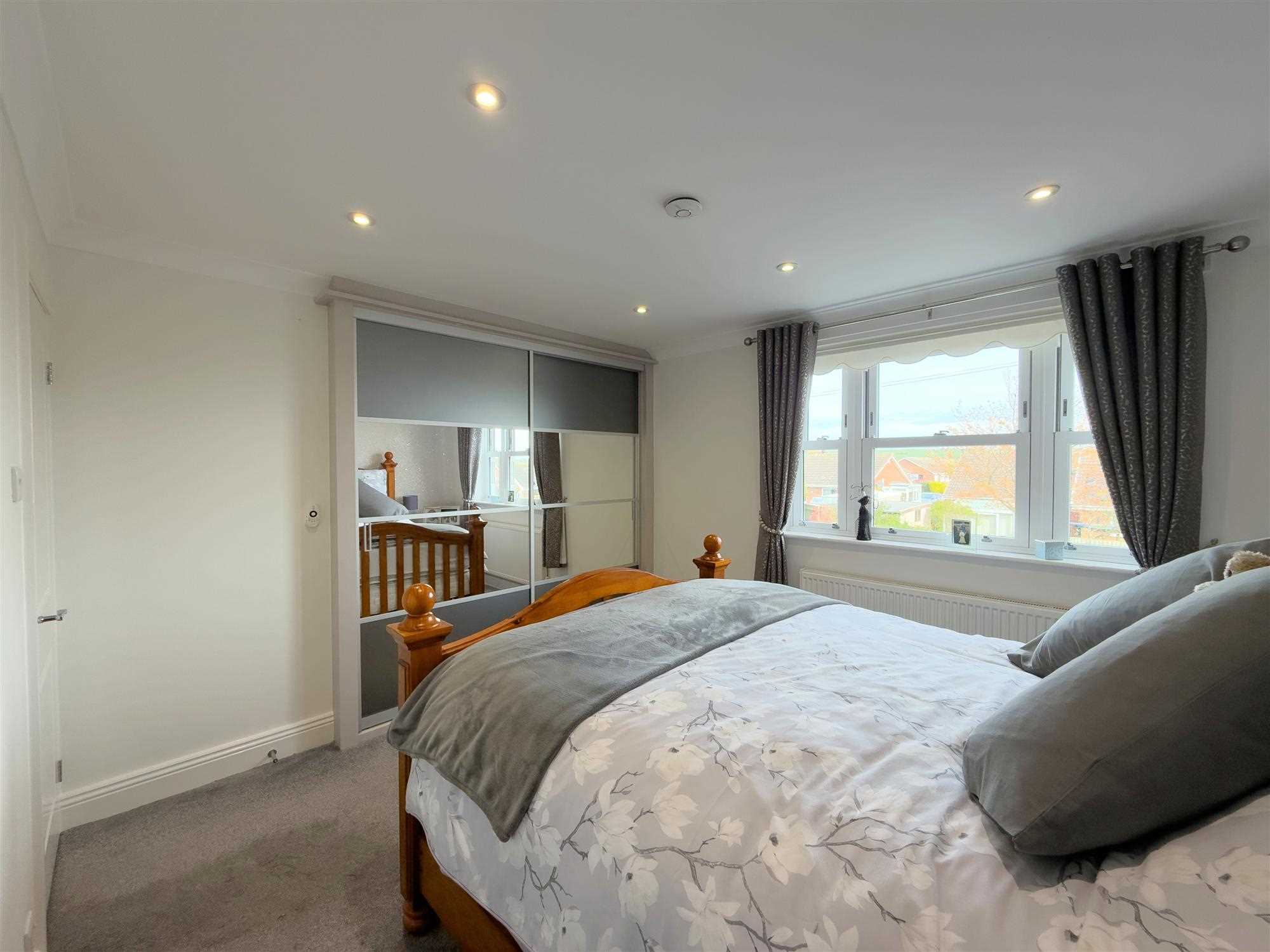 UPVC double-glazed window to front with countryside views in the distance. Central heating radiator. LED spotlighting. Range of modern Sharps mirror-fronted fitted wardrobes with hanging space, shelving and PIR lighting.