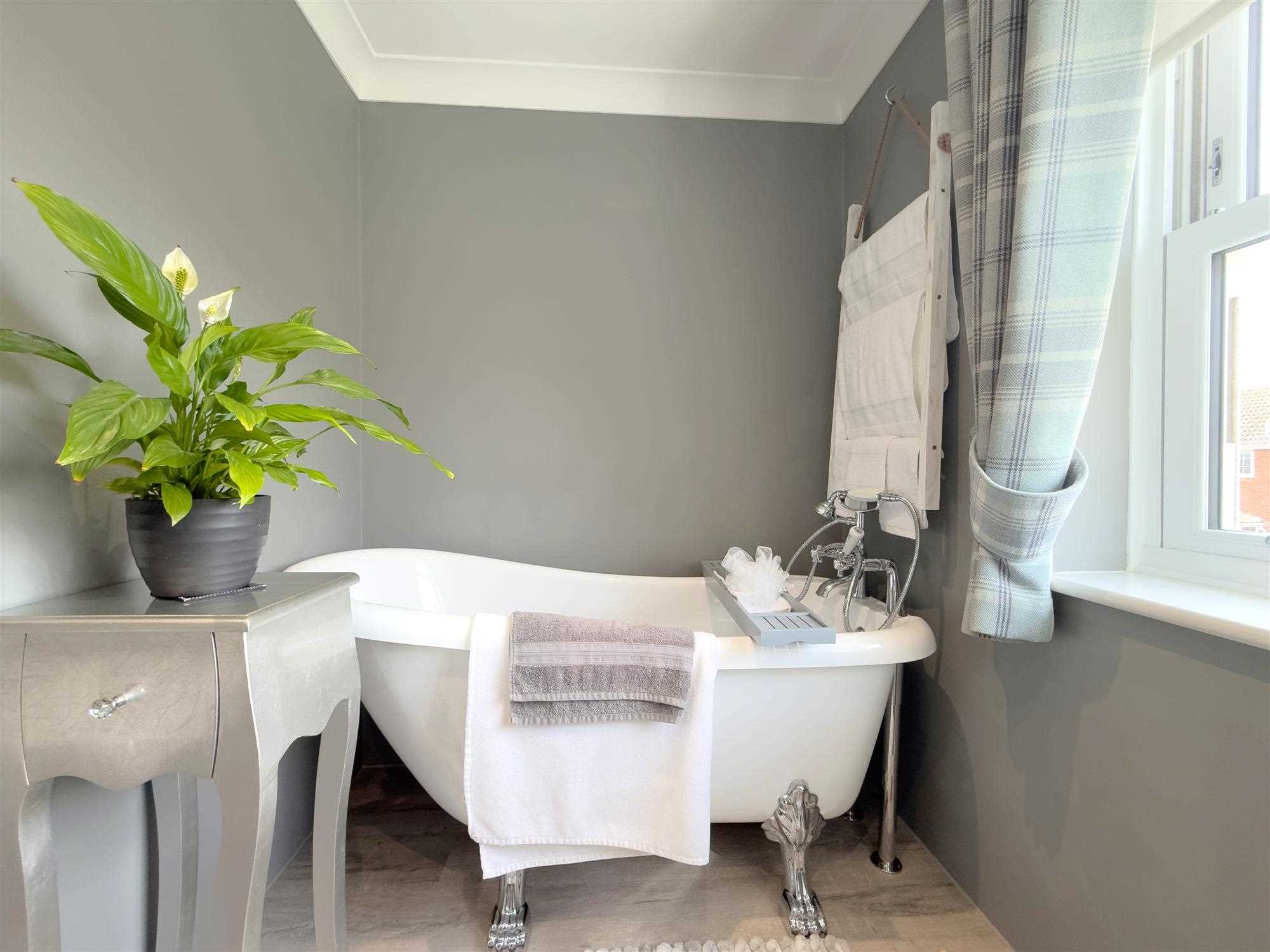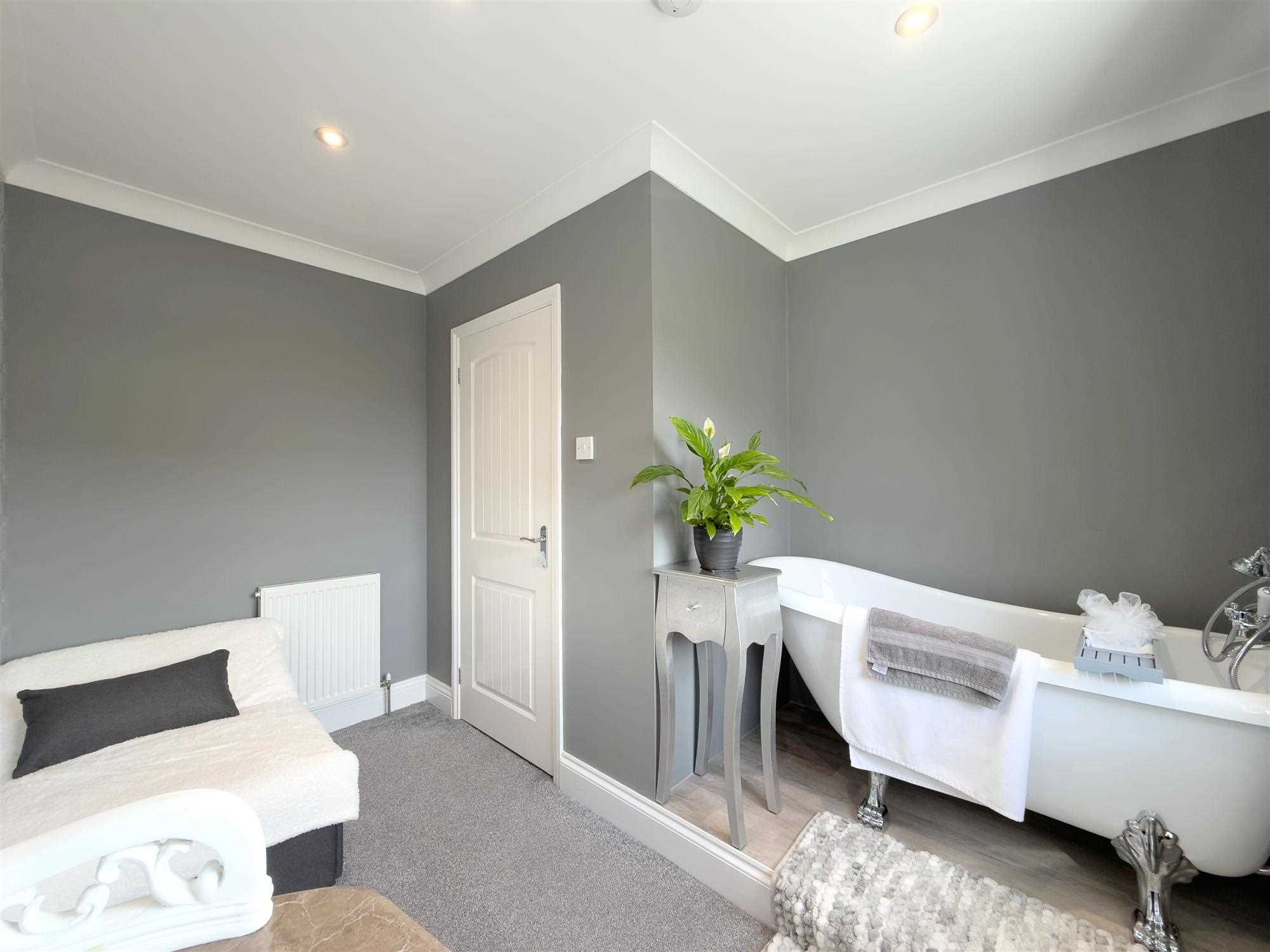 Newly fitted UPVC double glazed sash window overlooking the rear garden. Central heating radiator. LED spotlighting. Recessed area housing a freestanding claw foot bath with mains-fed taps and handheld shower attachment.